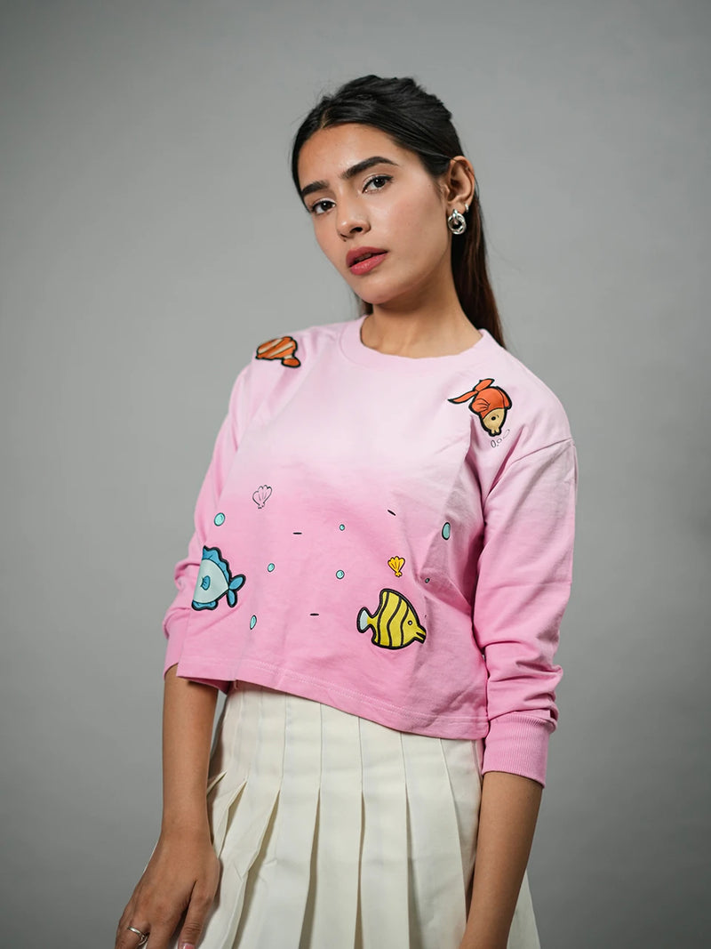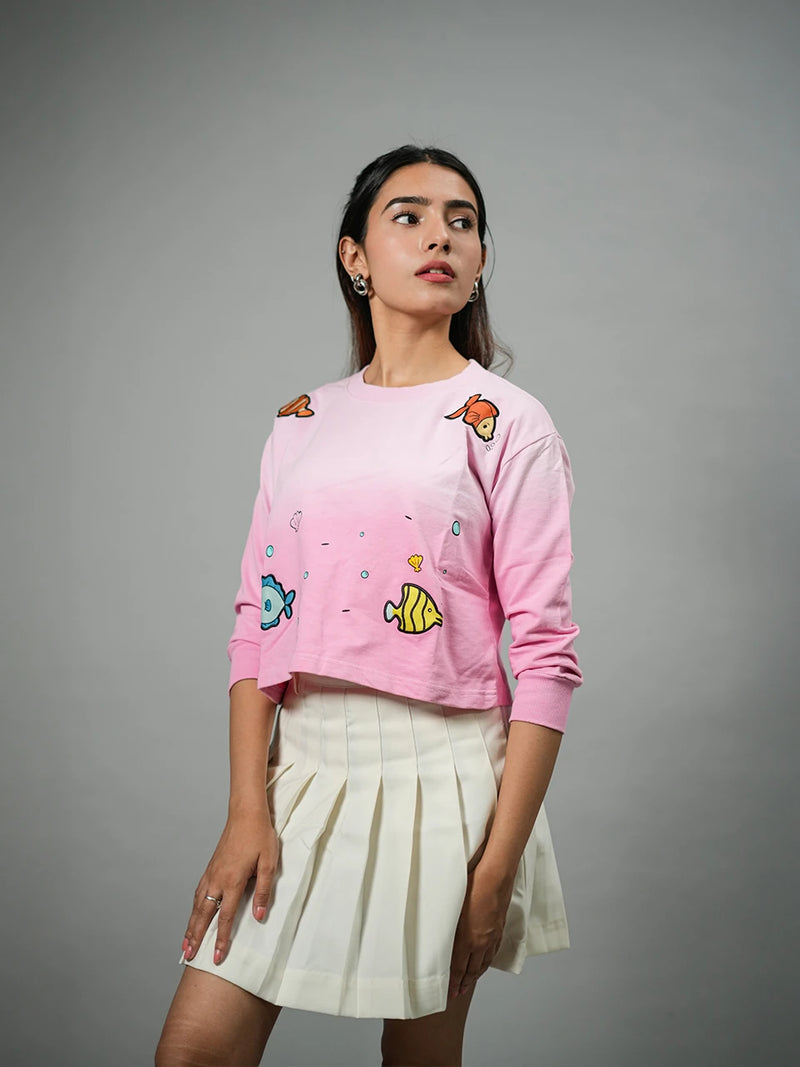 Serving ocean-core vibes with pop art fish, bubbles, and pastel sass, this cropped long sleeve is playful, comfy, and cartoon-level cute. Chill but stunning, it’s the serotonin boost your closet needs.