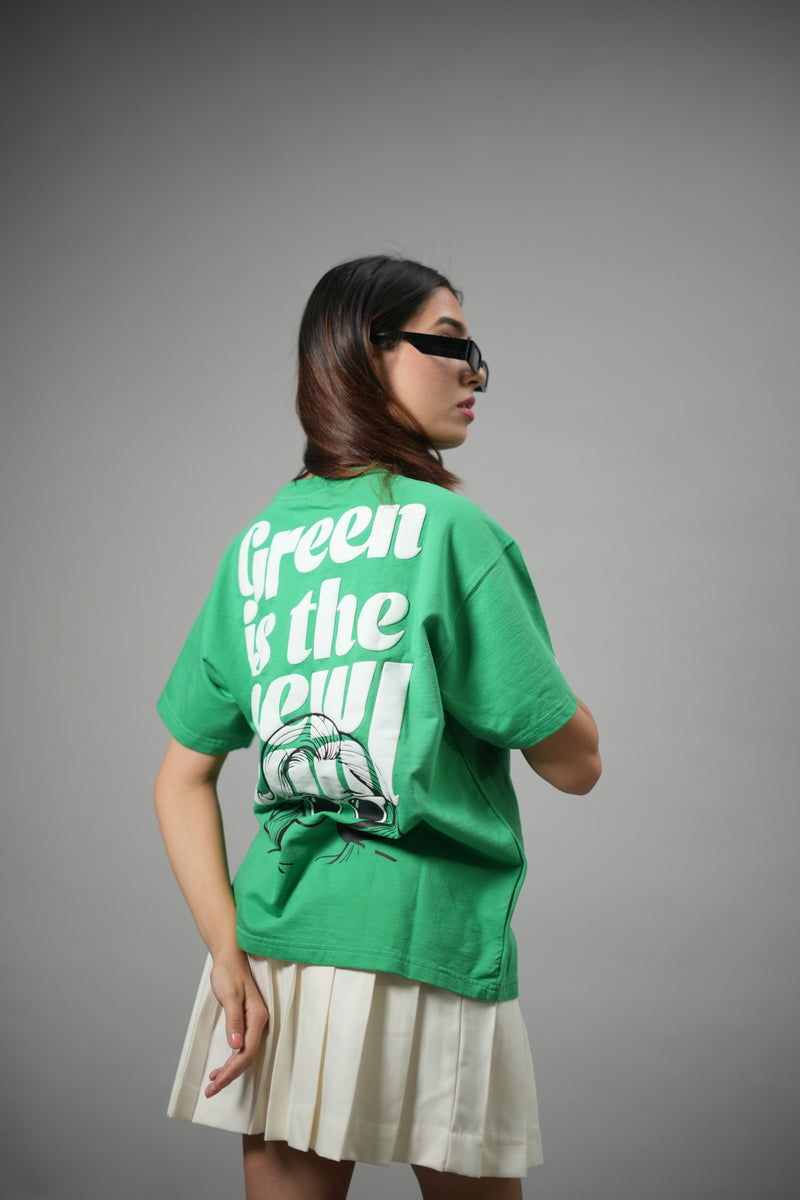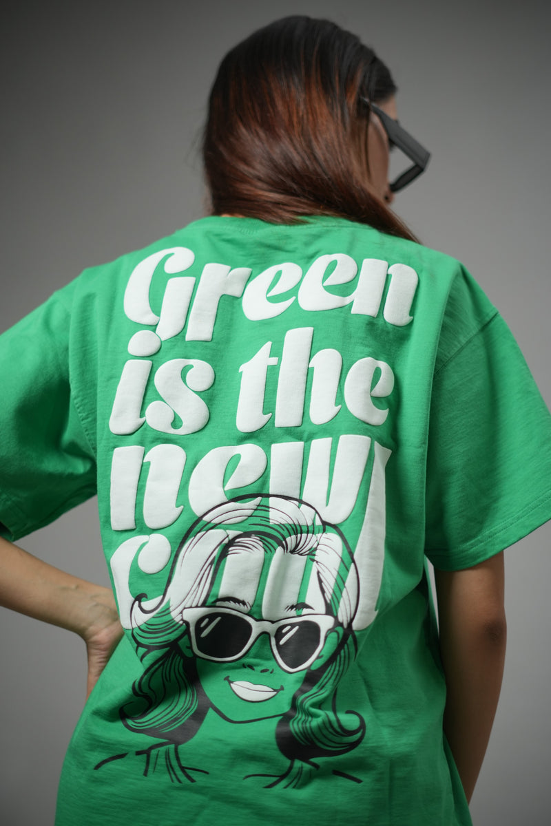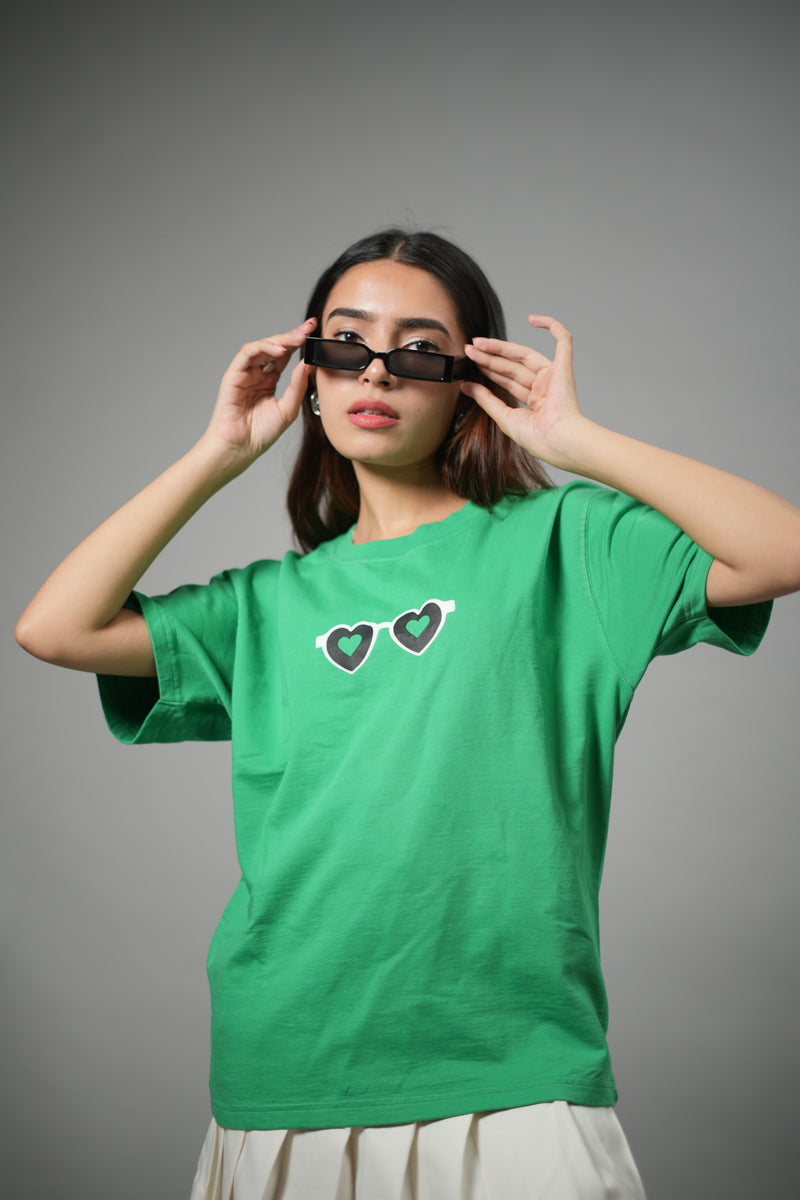 The Green: Loud Without Saying a Word Tee is more than a T-shirt; it’s presence on cotton. Designed in a vibrant green that turns heads, it features puff-printed heart sunglasses on the chest and a bold back print declaring “Green is the New Cool.” Minimal in front, statement in back, this relaxed-fit tee is for women who set trends, move with purpose, and own every scene.