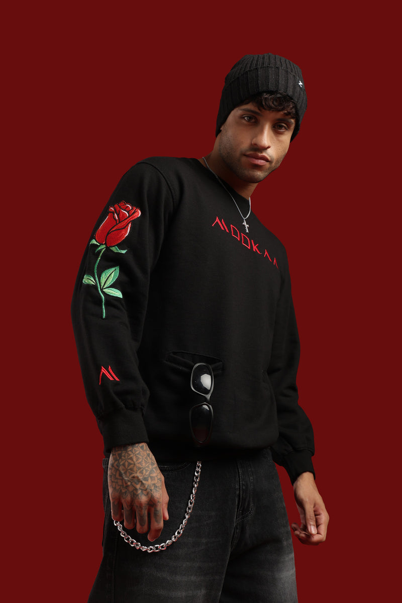 Mookaa’s 300 GSM One Last Chance sweatshirt blends romance, risk, and rebellion in a bold black fit. With iconic red rose sleeve prints, it’s winterwear with an edge deliberate, unapologetic, and built for those who thrive on last shots.