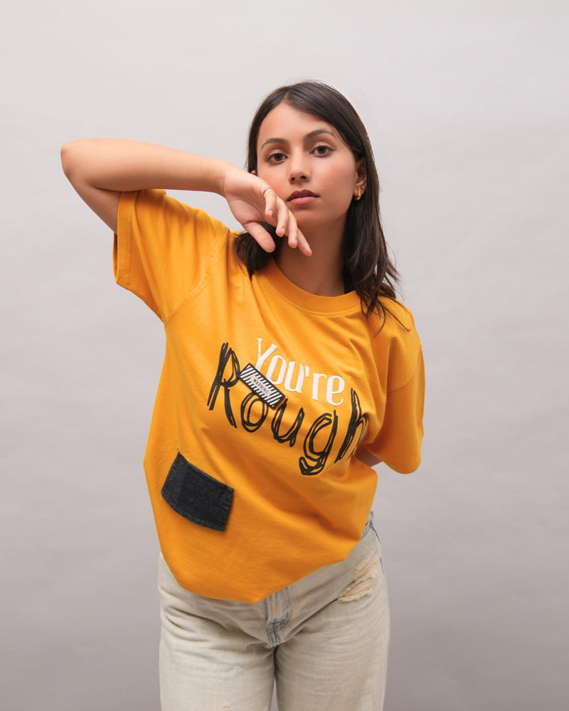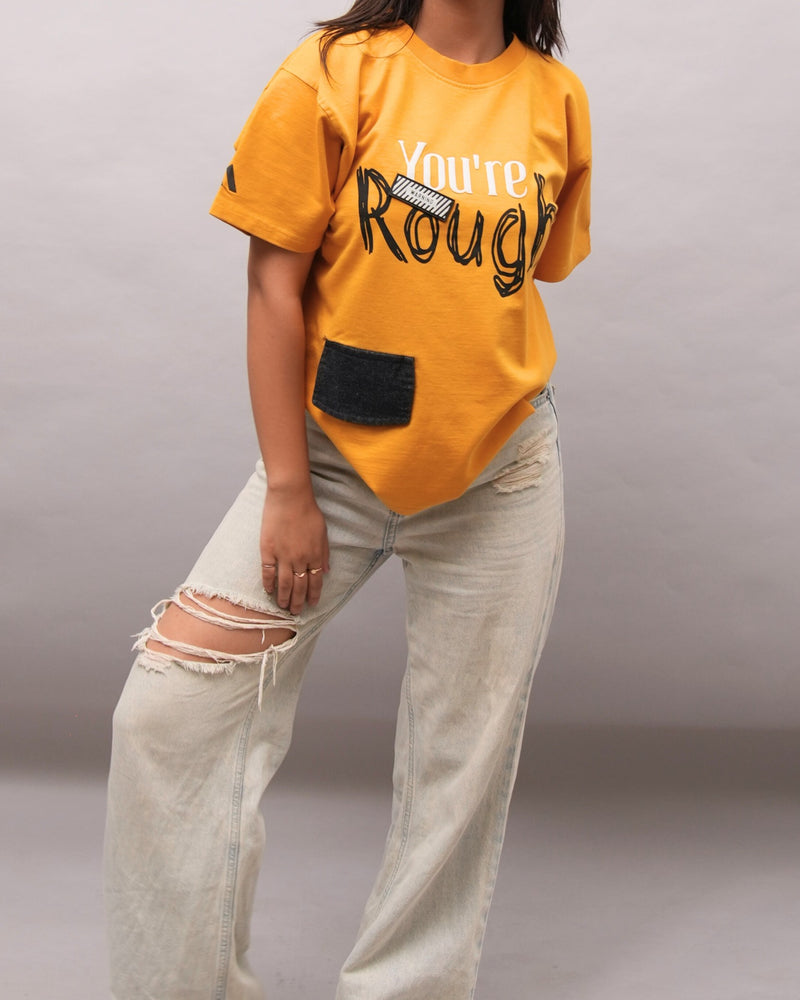 The You’re Rough Tee isn’t here to play nice. Bold mustard yellow, glitchy graffiti text, raw pockets, and contrast stitching make it a streetwear statement. With warning patch details and chaotic energy, this tee is for when you’re unapologetically yourself loud, misunderstood, and impossible to ignore.