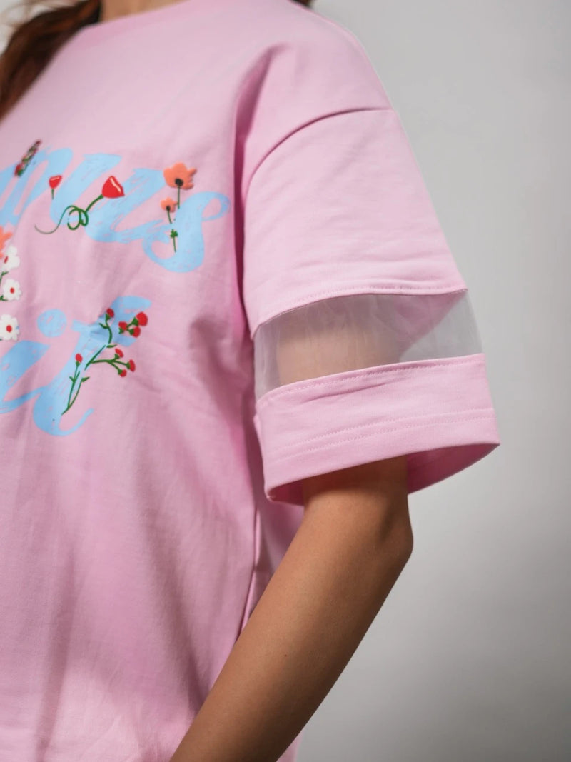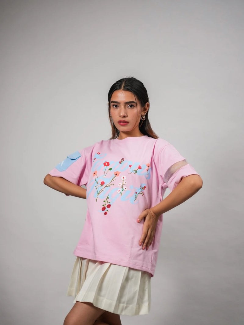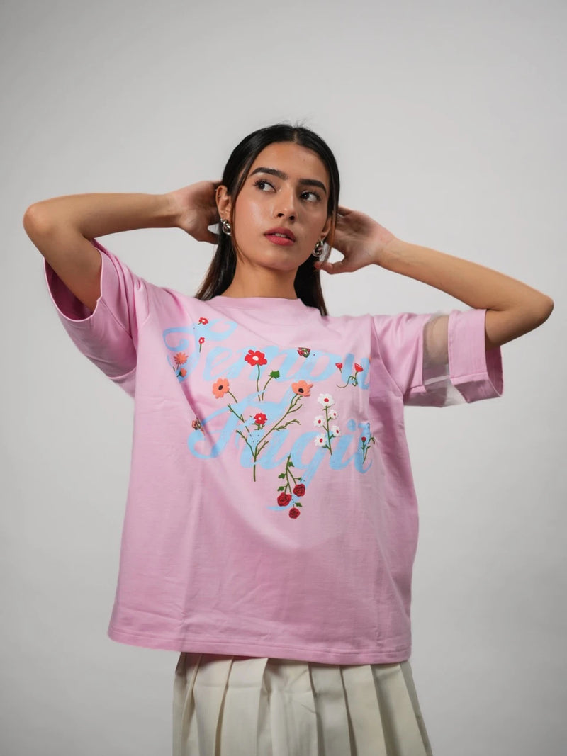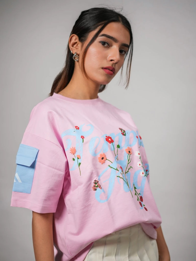 Capture the beauty of fleeting moments with this pastel pink tee, featuring a standout blooming puff print and the raised “Tempus Fugit” detail, Latin for “time flies.” Subtle mesh panel cutouts on the sleeves and mock button accents on the front add street-inspired twists, while a clean back stamp keeps the design minimal. Perfect for those who love thoughtful details in simple silhouettes, this tee is a gentle reminder to stay present, even as time flies.